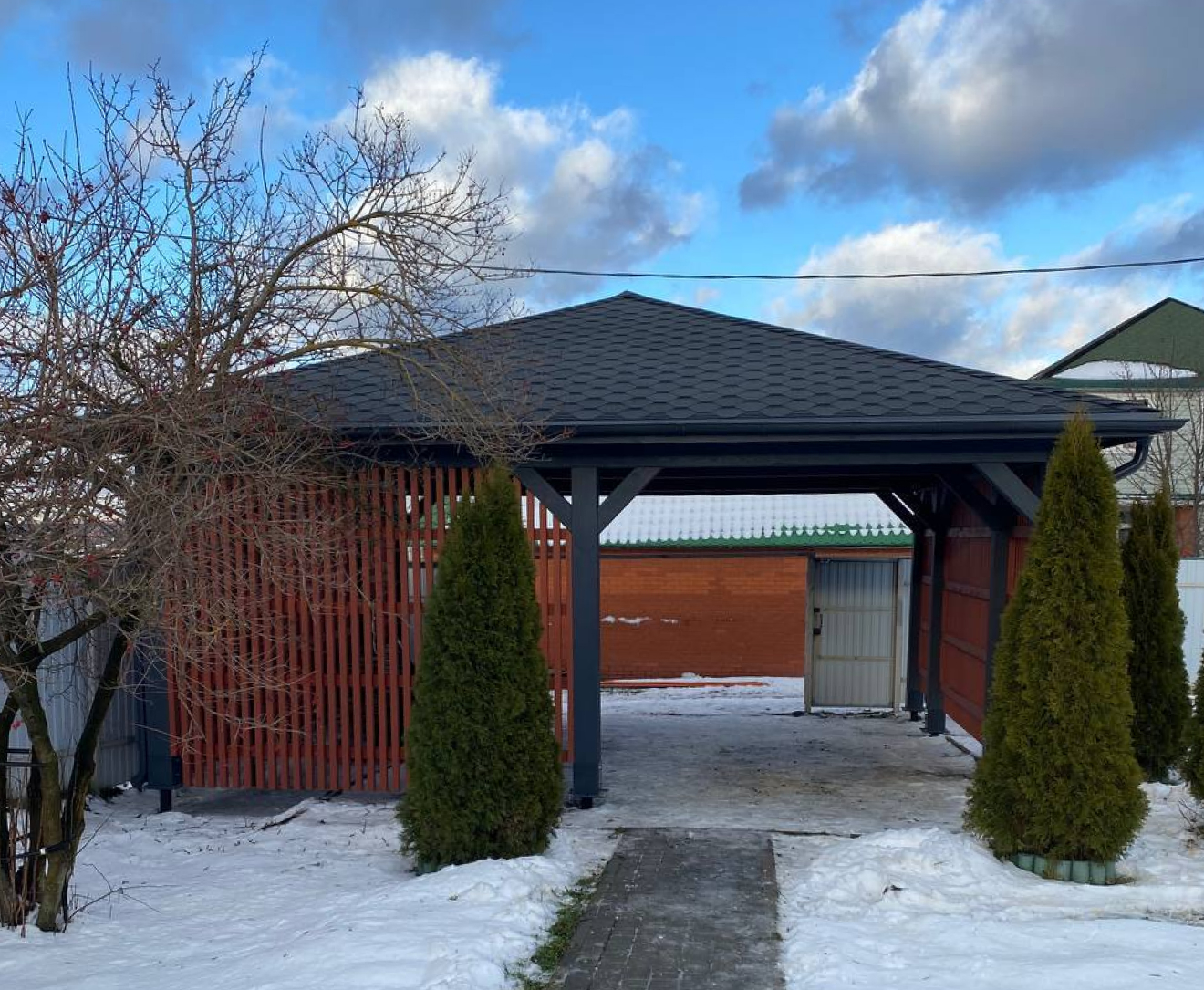 Добрый день! Хочу выразить благодарность компании Русские навесы за качественную работу. Долго выбирали и сомневались, но менеджеры помогли и ответили на все вопросы, цена понравилась. В итоге, мы с мужем остались очень довольны новой постройкой на участке. Навес смотрится красиво и машина защищена от дождя и снега. Даже дети туда стали парковать свой вело транспорт. Конечно, сейчас думаю, что можно было взять навес с пристройкой, а так придется подумать и купить летнюю кухню... Уже начала присматривать, хорошо, что в Русских навесах есть и такие товары - можно заказать по индивидуальному проекту, что очень удобно. Всем советую - ребята профессионалы своего дела.
