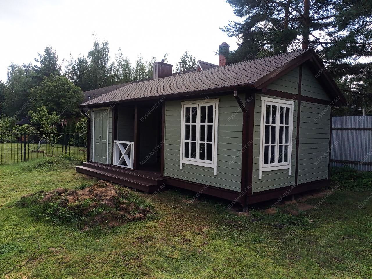 Конструкция изготовлена из хвойных пород древесины (ель, сосна). Материал — массив сухой строганный камерной сушки + клееный брус. В крепеже не используем черных саморезов, только желтопассированные. Крепеж не является сборно – разборным..