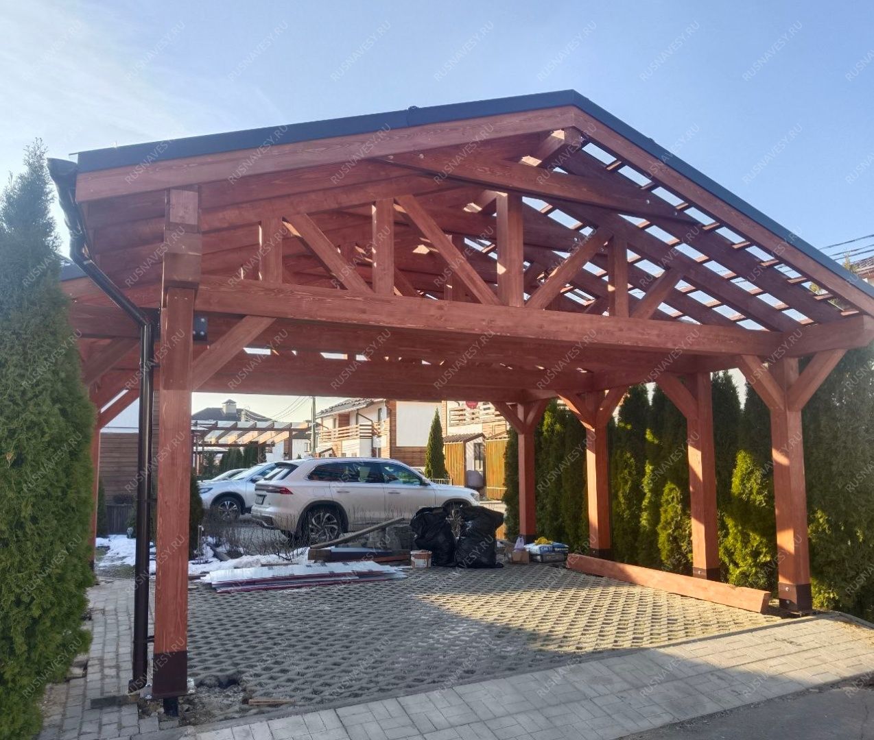 Навес для автомобилей Аларес — это функциональное и сбалансированное решение для защиты двух транспортных средств на компактной территории. Габариты 6,6×5,1 м и площадь 34 м² позволяют разместить автомобили с удобными проходами и достаточным пространством для открывания дверей, не занимая лишнюю землю на участке. Коньковая крыша с двумя скатами обеспечивает эффективный водоотвод и предотвращает скопление снега, что особенно важно в условиях частых осадков. Каркас выполнен из высококачественной хвойной древесины, прошедшей камерную сушку, что исключает деформации и гарантирует долговечность строения. Отсутствие хозблока делает всю полезную площадь доступной для парковки, а грамотная конструкция позволяет органично вписать навес в любой ландшафт. Кровельное покрытие из битумной черепицы "Shinglas" обеспечивает надежную защиту от осадков и придает навесу законченный вид.