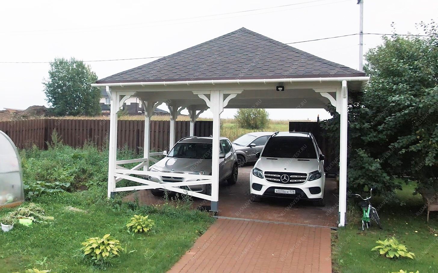 Навес с четырёхскатной крышей на 2 машины ГРИНФИЛД выделяется четырехскатной крышей, которая равномерно распределяет нагрузки от ветра и осадков, повышая общую надежность в изменчивом климате. Размеры 6×7 м с покрытием 42 м² создают простор для парковки двух автомобилей, облегчая доступ и маневрирование без тесноты. Построенный из сосны или ели с технологией камерной сушки, он подчеркивает натуральную прочность и защиту от влаги, с опорными элементами бруса 140×140 мм или 140×240 мм в цельном варианте (с возможностью перехода на клееный для полной гладкости поверхности). Стропильная часть на доске 45×190 мм обеспечивает жесткость каркаса, а кровельный слой из черепицы Shinglas "Соната" (персонализируемый) предотвращает протекания и добавляет изысканности. Монтаж выполняется оперативно, обслуживание несложное, а эстетика позволяет seamlessly вписать навес в садовый или дворовый ансамбль, превращая его в функциональный акцент для повседневного комфорта.