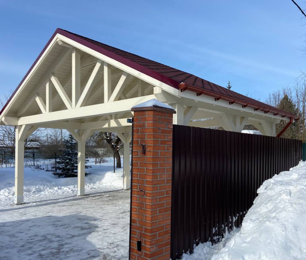 Двухскатный навес ВИЛЬЯМ габаритами 8×7 метров с интегрированным хозяйственным блоком создает пространство для одновременной парковки двух автомобилей и организации функциональной зоны хранения. Архитектурное решение с классической двускатной кровлей обеспечивает естественный сток осадков, предотвращая скопление снега и воды на поверхности. Основа конструкции сформирована из высококачественного хвойного массива камерной сушки, прошедшего специальную обработку для минимизации усадки и деформации в процессе эксплуатации. Несущие стойки выполнены из бруса 190×240 мм, обеспечивающего повышенную устойчивость к ветровым нагрузкам и гарантирующего долговечность сооружения. Наружная отделка хозблока представлена профилированной имитацией бруса 21 мм с замковым соединением шип-паз, исключающим образование щелей и обеспечивающим надежную защиту от внешних воздействий. Внутреннее пространство хозблока обшито аналогичным материалом толщиной 16 мм, создавая комфортную зону для хранения инвентаря. Кровельное покрытие из финской гибкой черепицы Shinglas коллекции "Соната" обладает высокой эластичностью и устойчивостью к перепадам температур, сохраняя свои свойства в экстремальных климатических условиях. Все деревянные элементы обработаны защитными составами, препятствующими гниению, воздействию ультрафиолета и атаке насекомых. В комплектацию входят металлическая дверь повышенной прочности и деревянное окно с одинарным остеклением, обеспечивающее естественное освещение внутреннего помещения. Дополнительные опции включают выбор альтернативных кровельных материалов, установку на различные типы оснований и нанесение защитной пропитки Tikkurila Ultra с сохранением качества на 7-10 лет. Качественная сборка и внимание к деталям делают навес ВИЛЬЯМ практичным и эстетичным дополнением к любому частному участку.