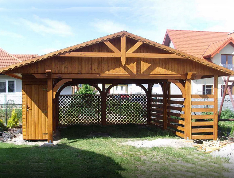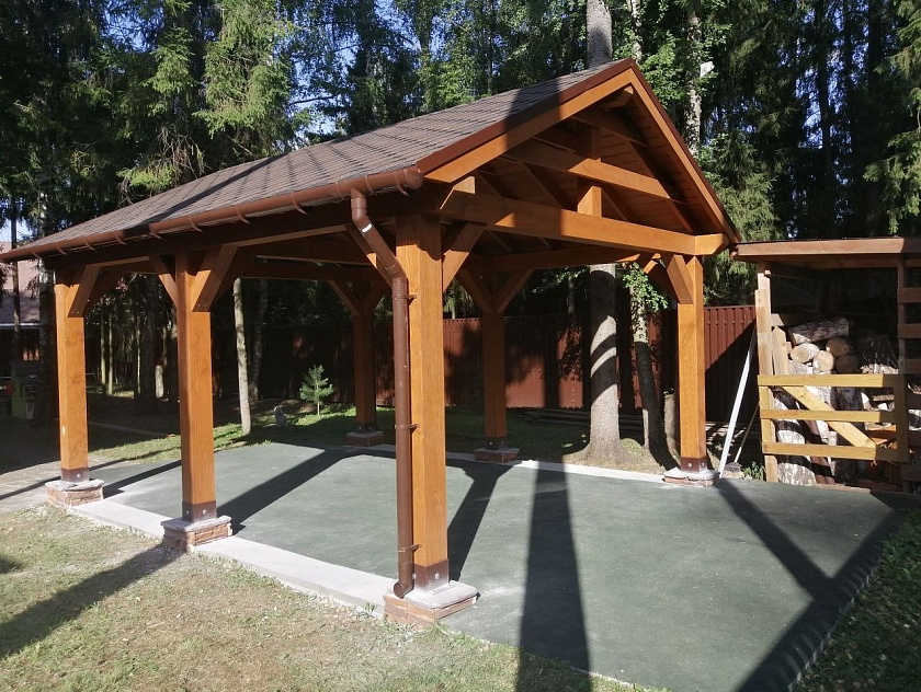 Деревянный навес на загородном участке – очень полезное, а порой и незаменимое сооружение. Он подходит для разных целей: для парковки автомобиля, обустройства зоны отдыха, хранения садового инвентаря, в качестве пристройки к дому. Помимо основного назначения, навес из дерева, как правило, выполняет декоративную функцию, создавая гармонию с домом и окружающей природой. Среди достоинств уличных деревянных конструкций: