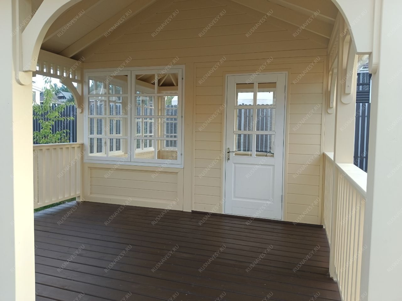 Конструкция изготовлена из хвойных пород древесины (ель, сосна). Материал — массив сухой строганный камерной сушки + клееный брус. В крепеже не используем черных саморезов, только желтопассированные. Крепеж не является сборно – разборным..